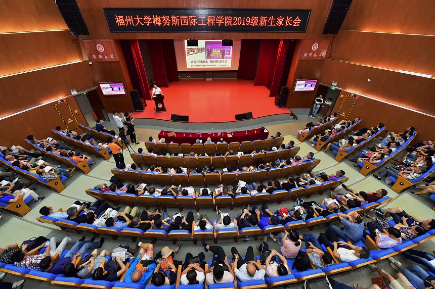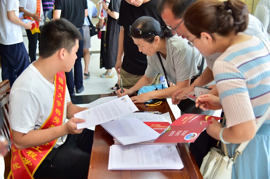 新生家长们陆续抵达会场并领取材料