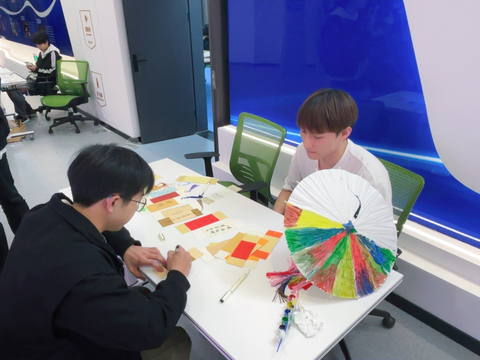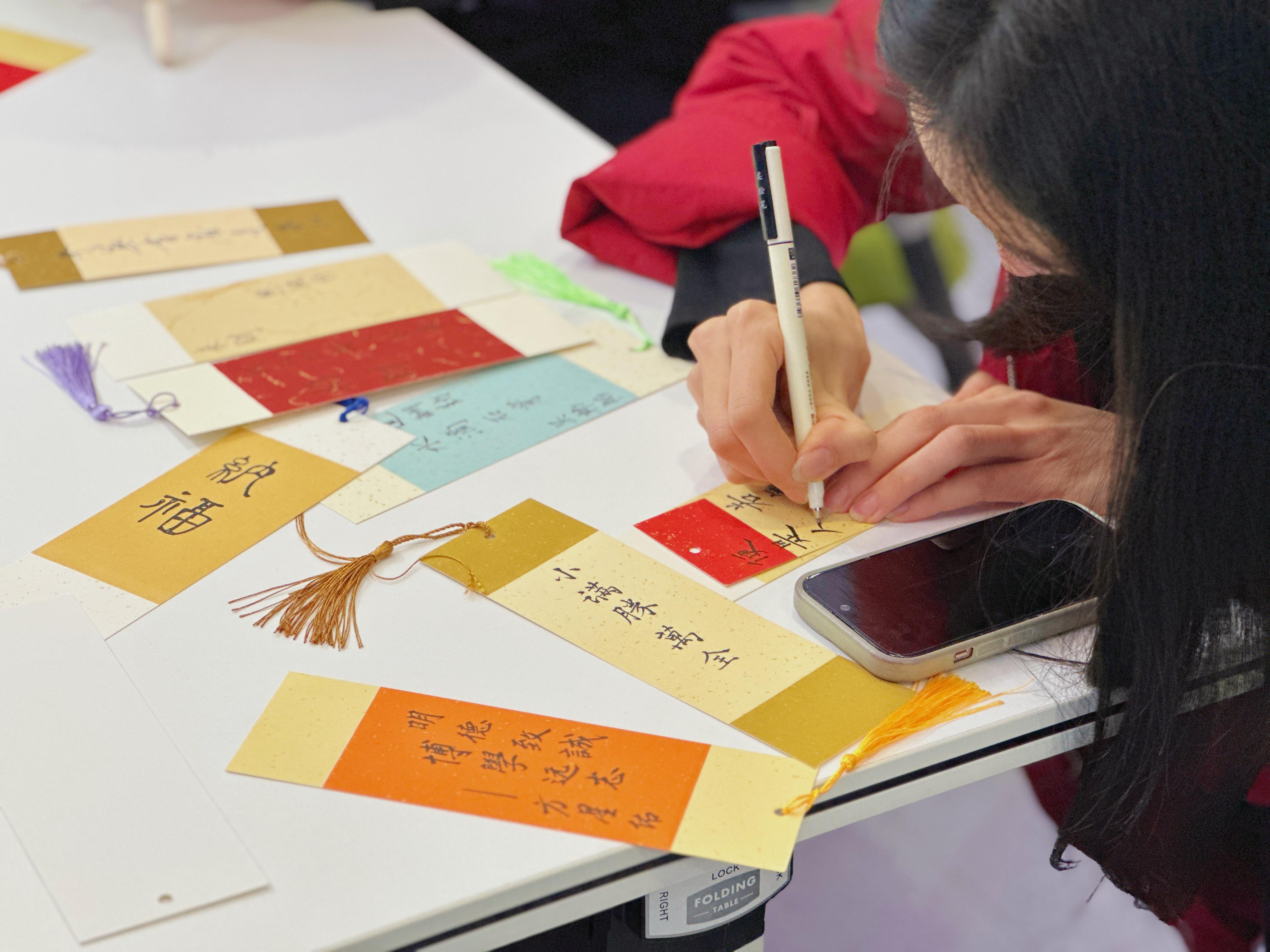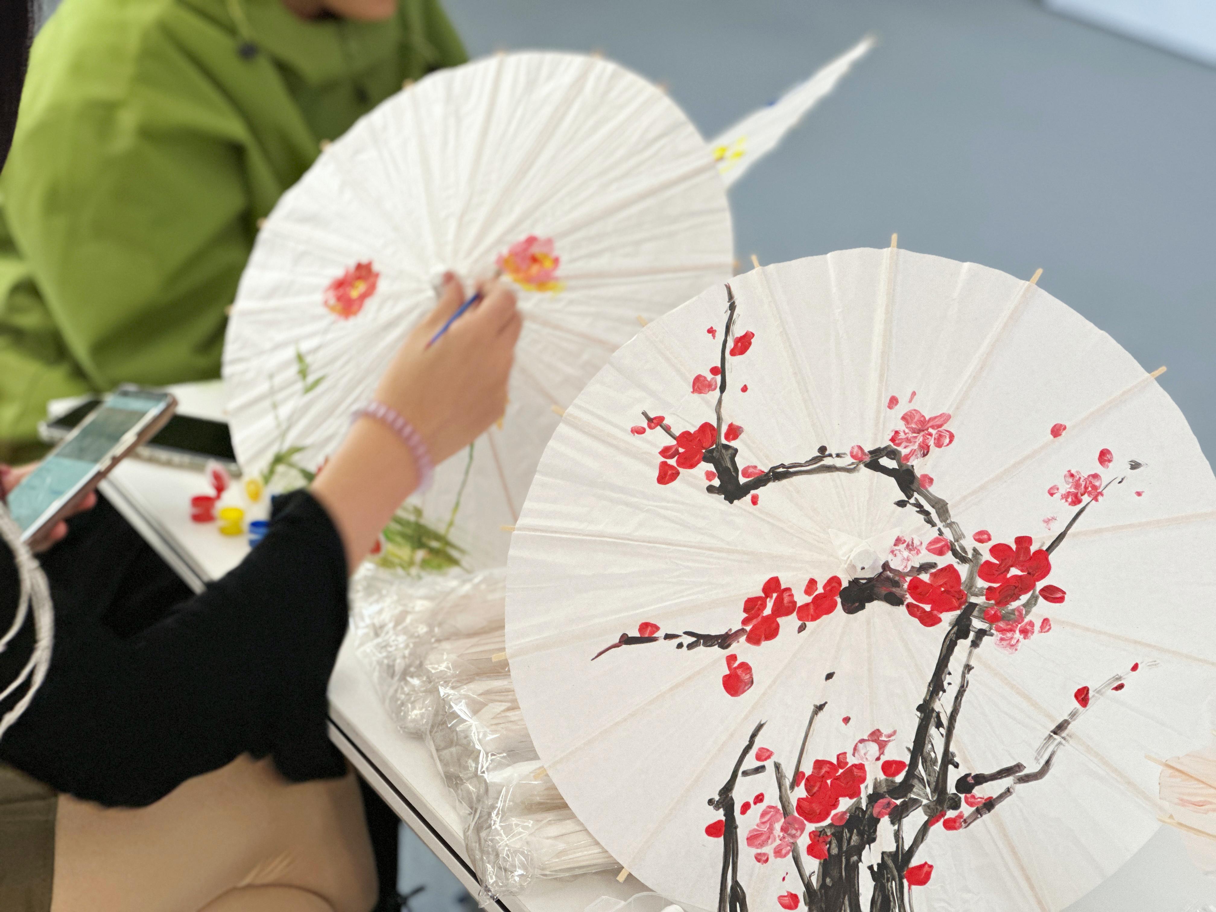在学院长廊中,中爱文化主题展位交相辉映。中国传统文化体验区内,师生们亲手制作创意十足的漆扇,在书签上留下自己的字迹,在一把把油纸伞上绘出优美的图案。