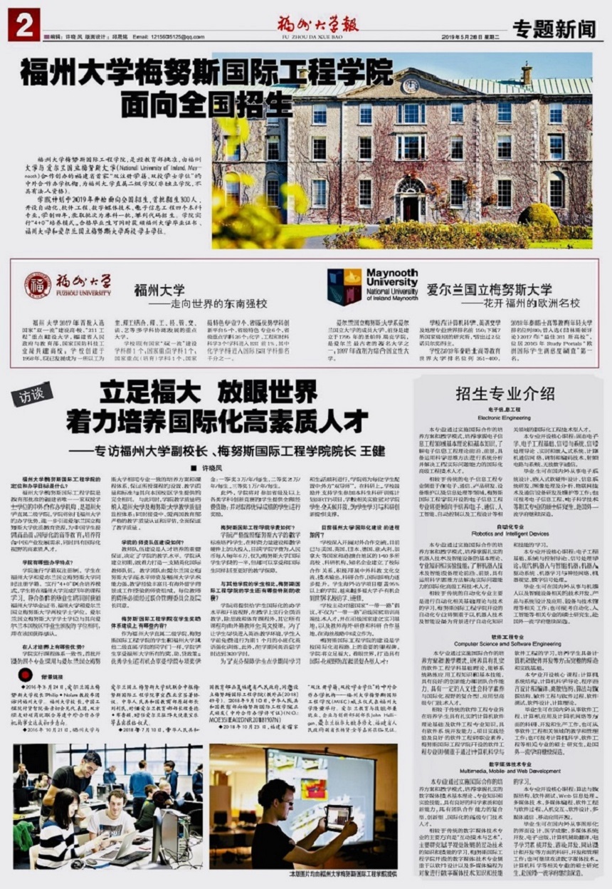 2019年5月28日,第783期《色色视频 报》在第二版以《色色视频 面向全国招生》为题对学院进行了整版专题报道,并以《立足福大 放眼世界 着力培养国际化高素质人才》为题专访色色视频 副校长、学院院长王健教授,敬请关注!