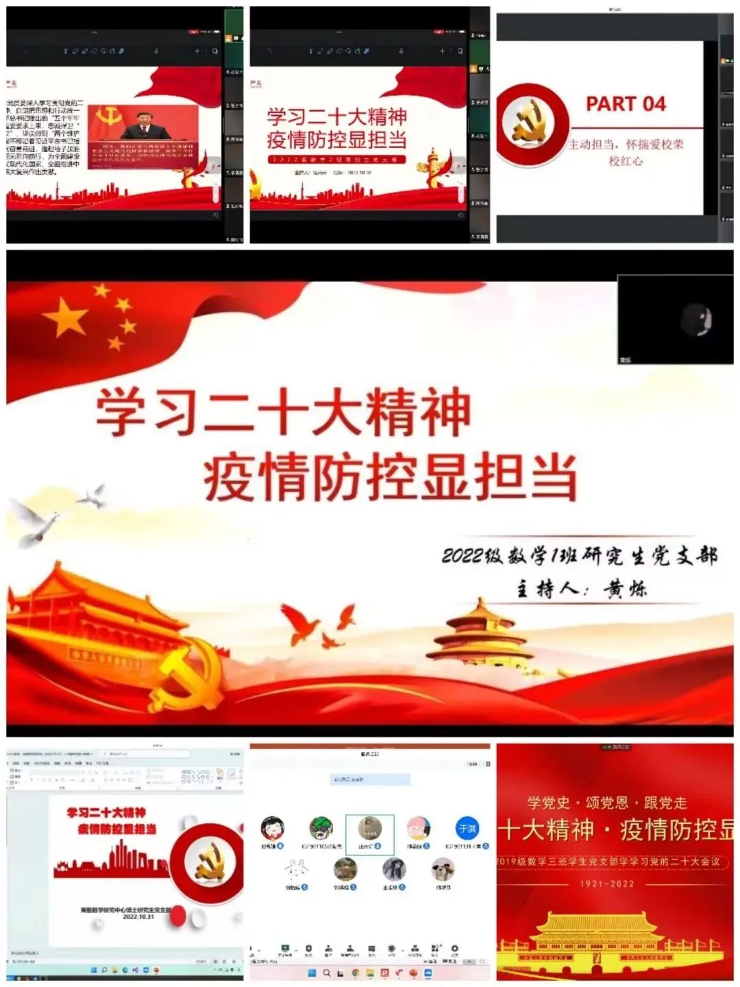 二十大会议召开之后,数学与统计学院党委组织各学生党支部通过网络方式开展“学习二十大精神,疫情防控显担当”为主题的党支部专题会议。各学生党支部在会议上对数统学子的责任与担当提出了要求,强调“广大党员要以强烈的政治责任感,切实把思想和行动统一到党的二十大精神和党中央决策部署上来,为全面建设社会主义现代化国家作出新的更大贡献。”本次专题会议,在学生党员中掀起了学习宣传贯彻热潮,指导了学生党员们的社会实践行动。