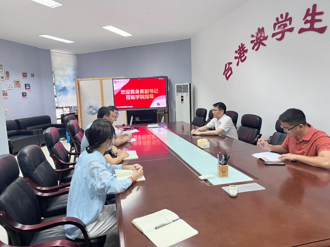 调研过程中,黄身勇副书记听取了学院关于学生工作、辅导员队伍建设、班团党组织建设及学院首届毕业生就业升学情况、取得的成绩、面临的困难挑战等。黄身勇副书记对学院所取得的成绩表示肯定,并就学院学生工作、辅导员队伍建设、班团党组织建设等方面给予了重要的指导和建议。黄身勇副书记强调,学院要结合自身办学实际,对标对表,把培养兼具深厚家国情怀和宽广国际视野的社会主义接班人作为学生工作的核心目标,切实推进中外合作办学的高质量发展。