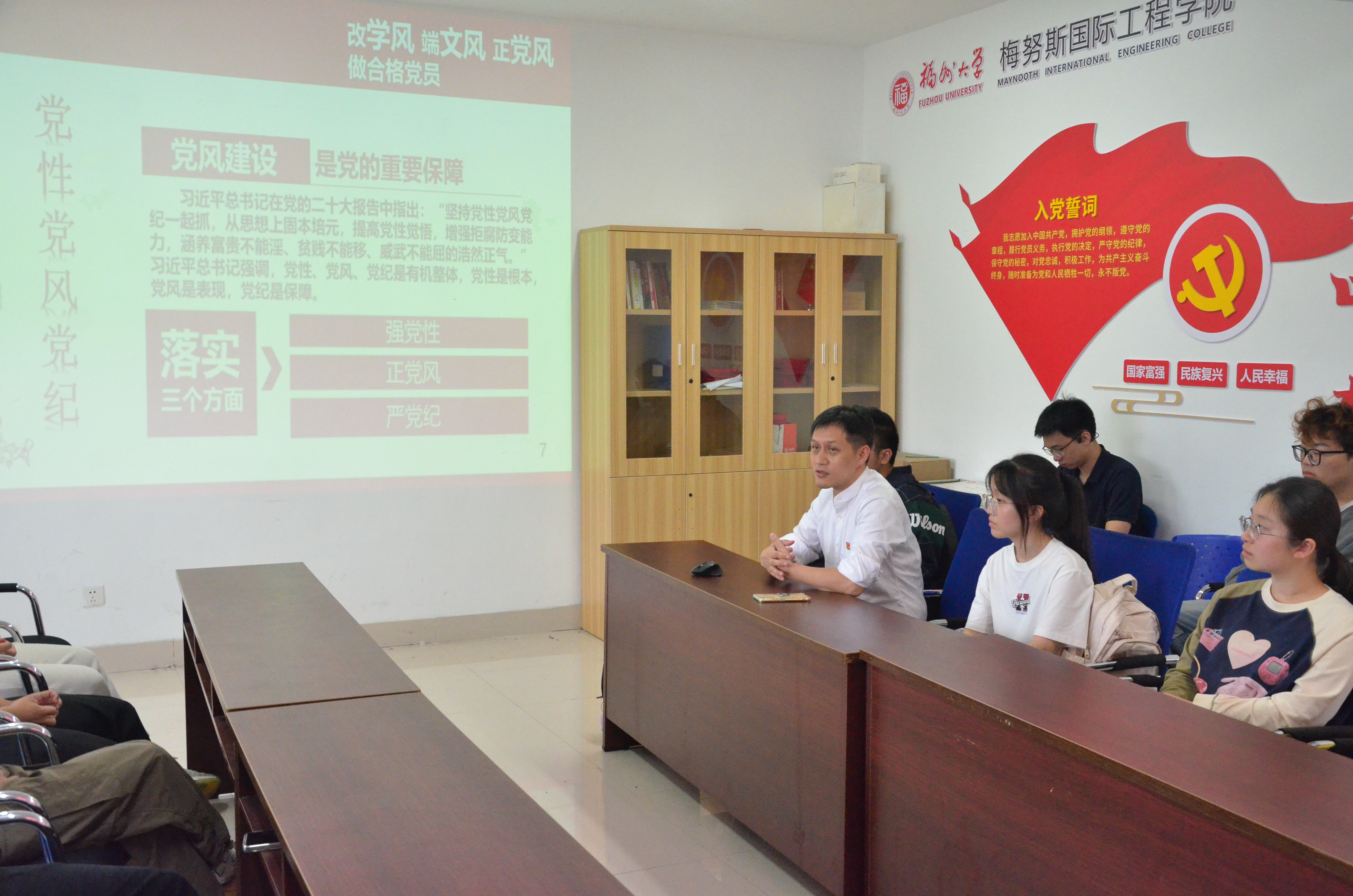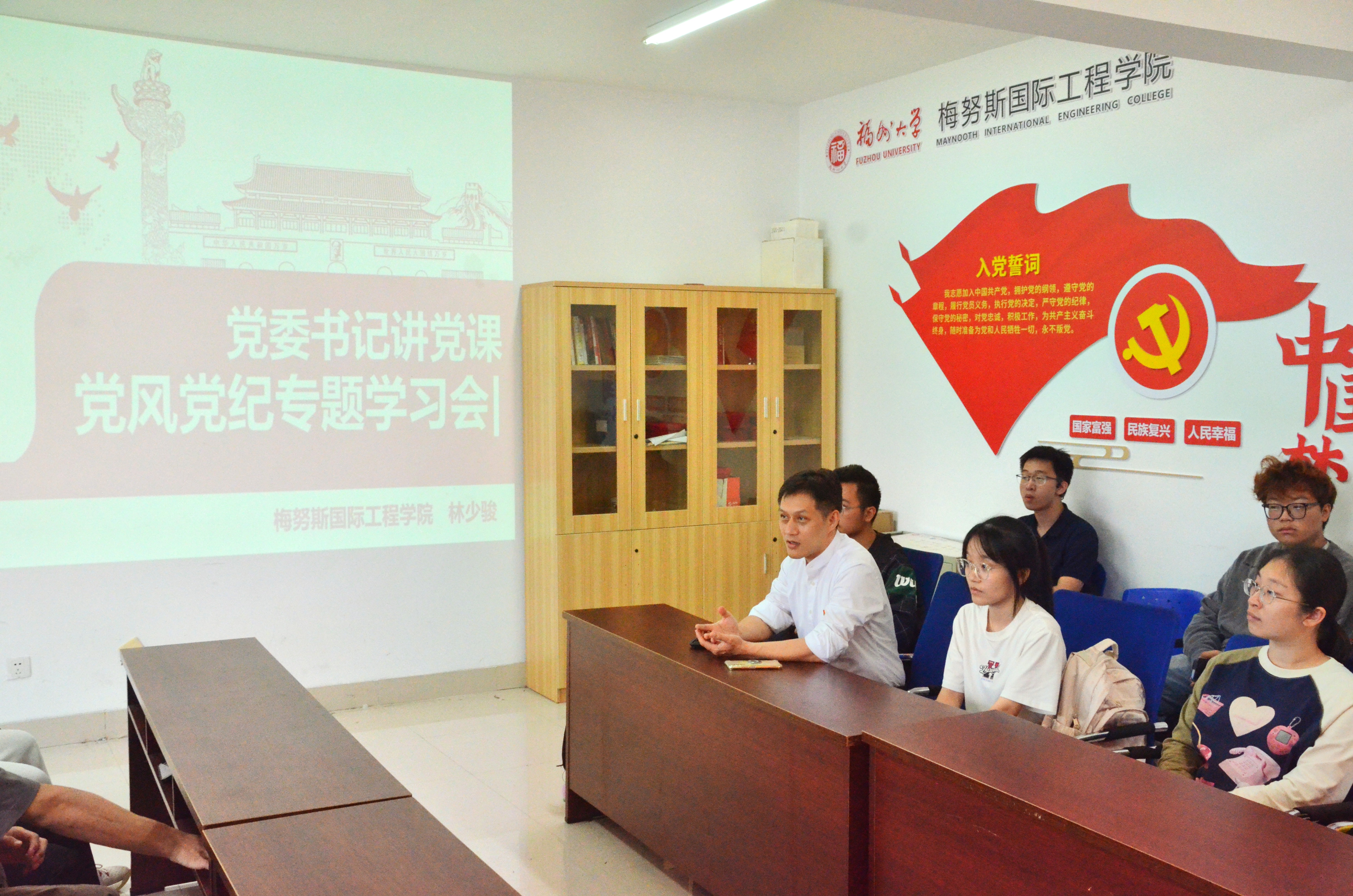 林少骏书记深入学生社区,为联系班级全体2023级软件工程1班学生及联系支部2021级电子信息工程党员代表上了一堂关于党纪教育的专题党课,指导学生深入学习《中国共产党纪律处分条例》并开展交流研讨。此次党课旨在进一步加强学生的党性教育,提高党员纪律意识,推动学院党风廉政建设。