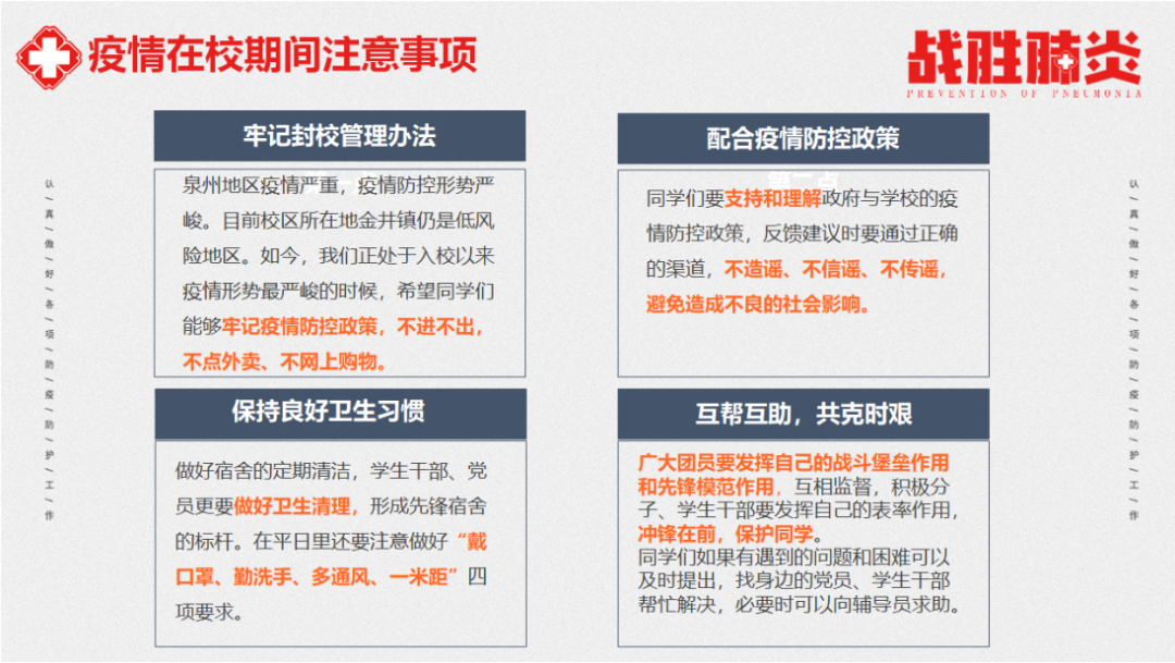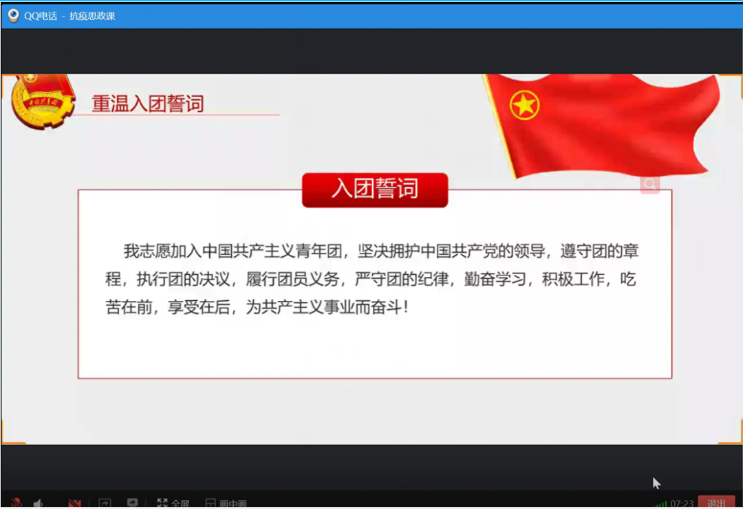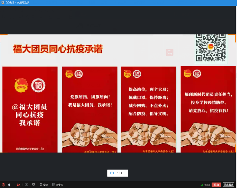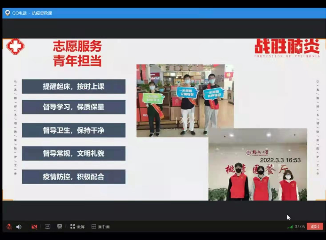 在团课中刘歆一老师从团员担当、疫情形势分析、防疫期间在校注意事项、志愿服务青年担当、福大团员同心抗疫承诺几个方面出发。强调身为团干、团员要高度认识到当前疫情防控工作的严峻性,坚持党的统一领导,服从学校的疫情防控管理规定,同时要在同学中起先锋模范带头作用,关注身边同学的思想动态,响应学校防疫号召,积极投身志愿服务活动,模范参与线上学习和自主学习。