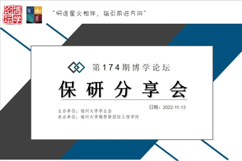 11⽉13⽇中午12点,为帮助全院同学更加了解保研历程,明确保研⽬标,完善个人计划,福州⼤学梅努斯国际⼯程学院学⽣会学习部承办的第174期博学论坛“保研分享会”成功开讲。