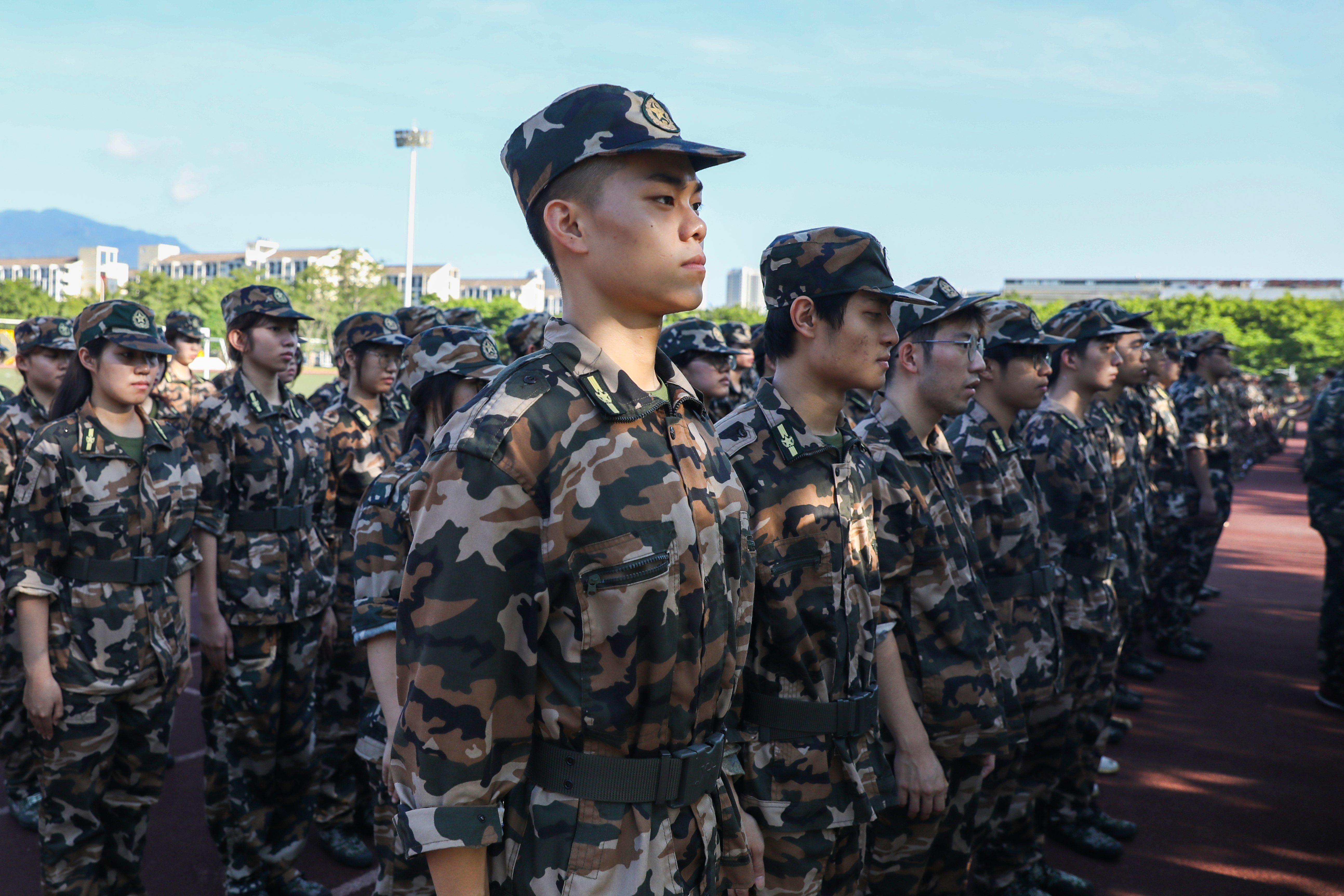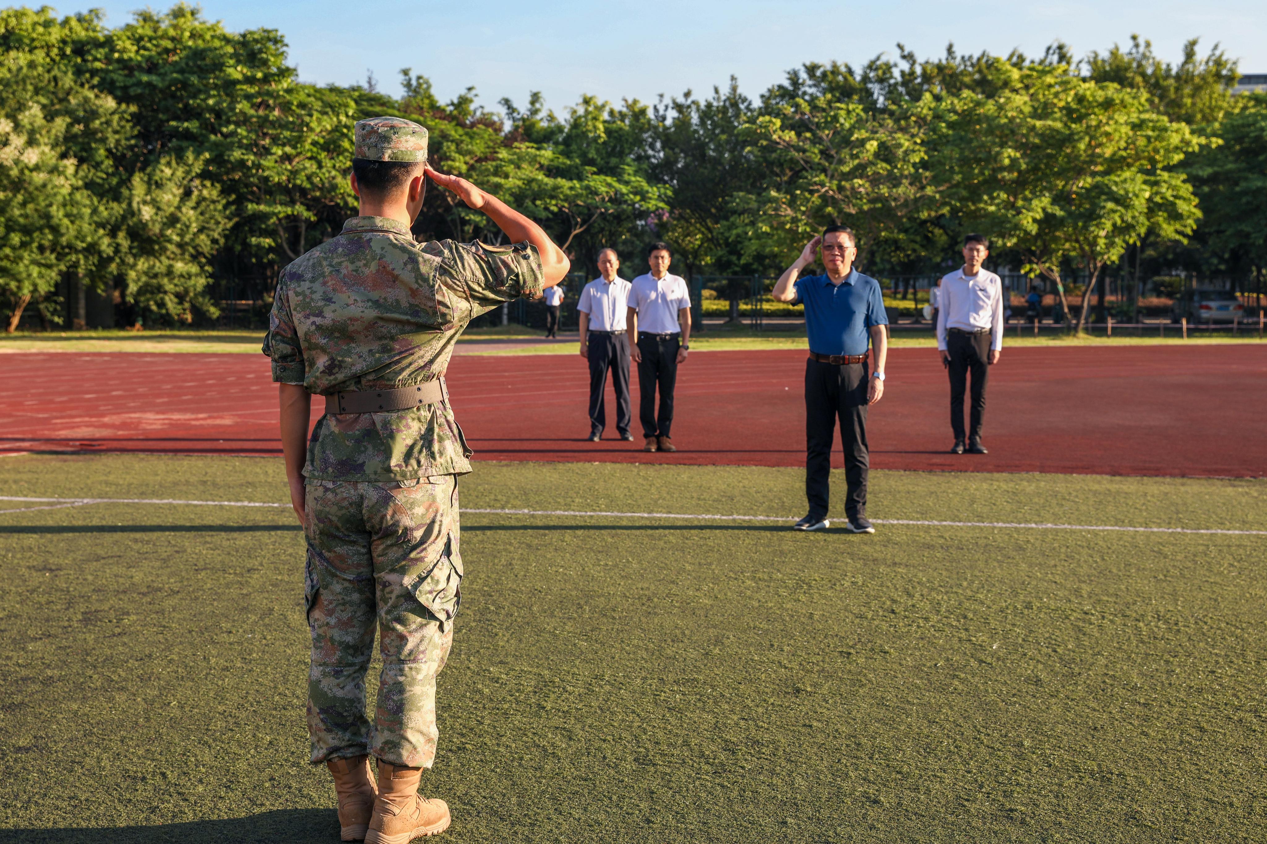7月12日上午,校党委陈国龙书记、黄身勇副书记、林键副校长、党政办王向阳主任一行到旗山校区军训现场,关心军训学生,慰问军训教官。
