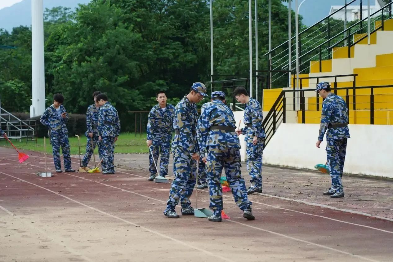 训练的间隙,同学们自发帮忙打扫了台风暴雨侵袭过后的操场