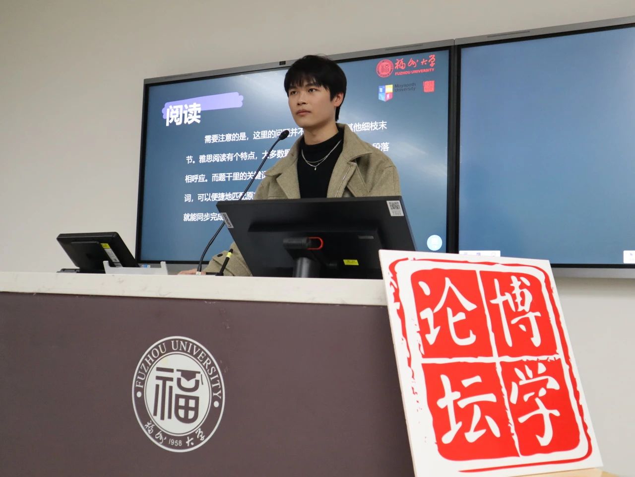 第二位主讲人林灿斌学长从听说读写四个模块展开介绍雅思的分数机制,并加上具体实际的题目,通过现场互动做题,让同学能直观感受到雅思考试的内容,在增强趣味性的同时也调动了同学们学习雅思的兴趣。林灿斌强调雅思考试注重学生的英语检索能力和逻辑能力,学生应该对同义替换和关键词有足够的敏感度。