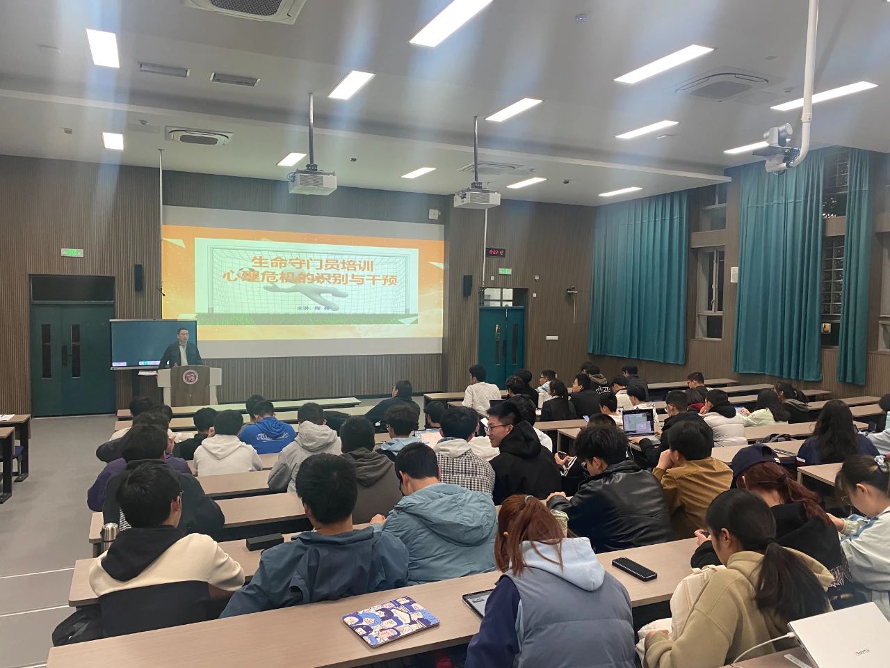 开展了“生命守门员”培训讲座。本次讲座邀请了陶亮老师作为主讲,各班班长、团支书、心理委员和各宿舍“生命守门员”参加。