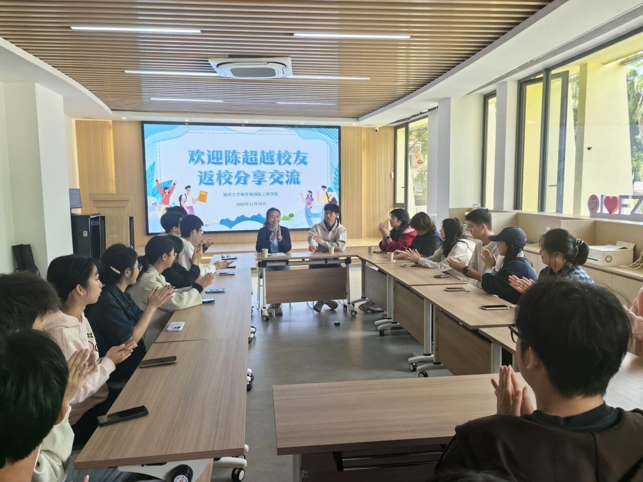 11 月 15 日学院举行校友返校分享交流会,由学院党委副书记王涛主持这场温情相聚。褪去赛场的热血,陈超越以学长的身份与在校生们促膝长谈。从当年在实验室与训练场之间的奔波,到如今在新加坡继续深造,他毫无保留地分享自己的求学经历与人生感悟:“大学时光既要仰望星空,也要脚踏实地,体育教会我的坚持,同样适用于学习和工作。”