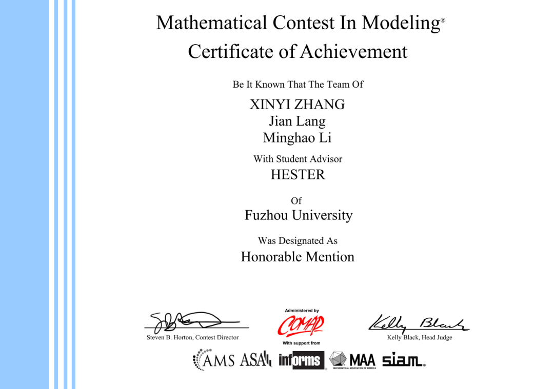 参赛学子取得佳绩:张欣怡(2019级自动化)、郎健(2019级自动化)、李名昊(2019级数字媒体技术)同学所组队伍荣获Honorable Mention(H奖)。