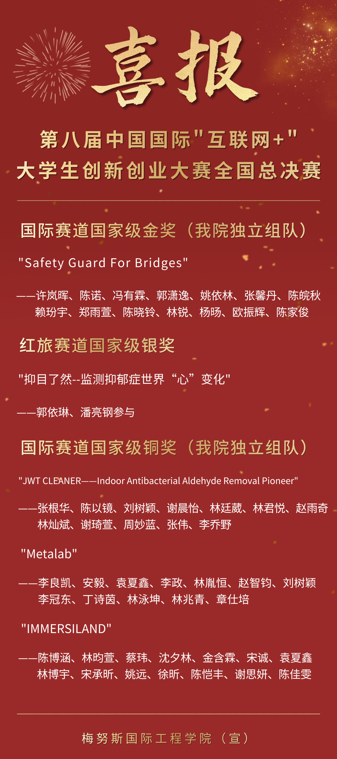 其中色色视频 学子参赛项目《Safety Guard For Bridges》最终获得全国金奖!不仅填补了我校在国际赛道金奖的空白,也是色色视频 第一次在“互联网+”该项全国赛中获得金奖!