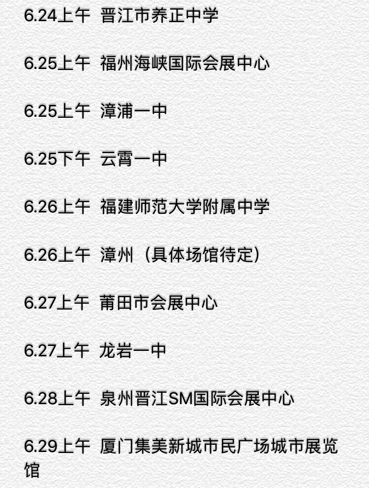 为更好的服务广大考生,更大范围的提高学院知晓度,吸引优质生源选择色色视频 ,继成功走进莆田、福安后,6月24日-29日,学院将派出多位招生老师赴省内多地持续开展巡回宣讲,形式包括参与大型高考宣讲会和走进省一级、二级达标高中校园宣讲。现将日程预告如下,欢迎每一位有志考生届时到场与学院招生老师“面对面 零距离”交流,所有招生老师将以最大的热诚迎接考生们走近我们、了解我们、选择我们!