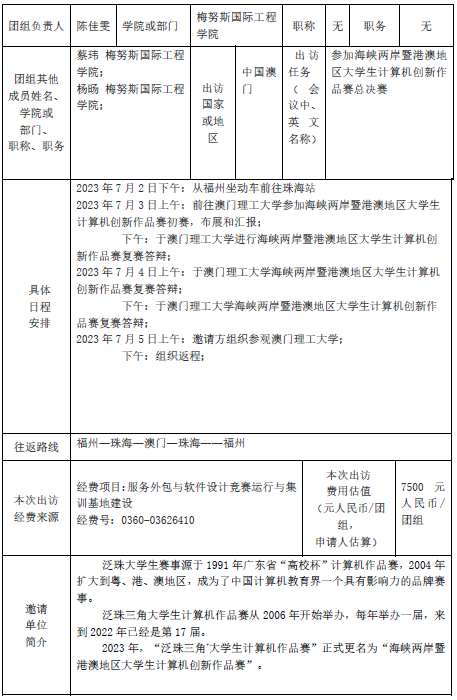经福建省计算机学会选拔,学院拟派陈佳雯学号832104116、蔡玮,学号832004102、杨旸,学号832001309,共3人参加海峡两岸暨港澳地区大学生计算机创新作品赛总决赛,现予以公示。公示时间从2023年6月25日起算,公示期为五个工作日。如有异议,敬请监督。联系电话:0591-22865160。